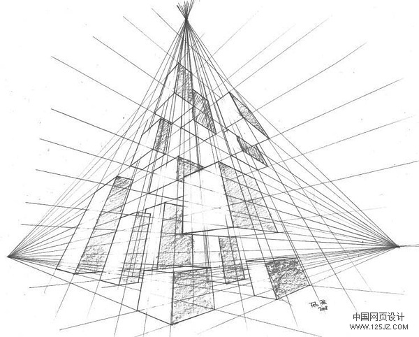 (二点透视)就是把立方体画到画面上,立方体的四个面相对于画面倾斜成一定角度时,往纵深平行的直线产生了两个消失点。